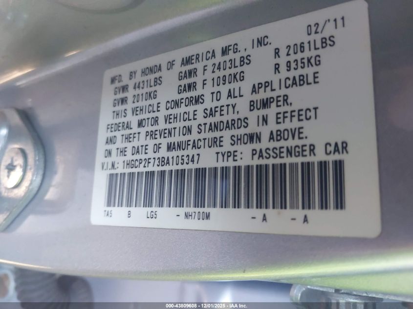 2011 HONDA ACCORD 2011 року Бензин, 2.4, Передний привод, vin - 1HGCP2F73BA105347 из США