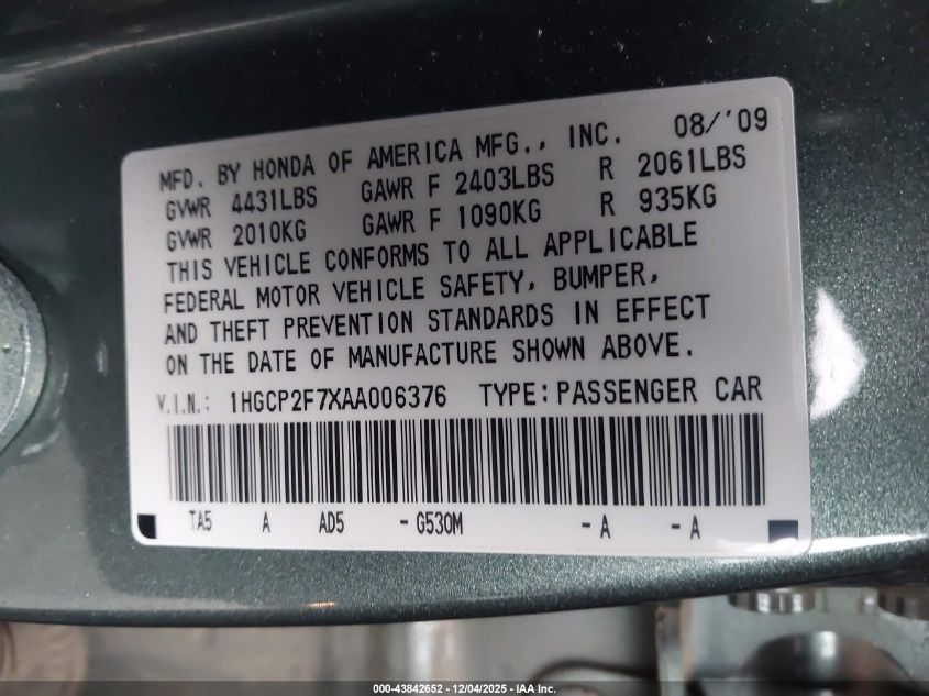 2010 HONDA ACCORD 2010 року Бензин, 2.4, Передний привод, vin - 1HGCP2F7XAA006376 из США