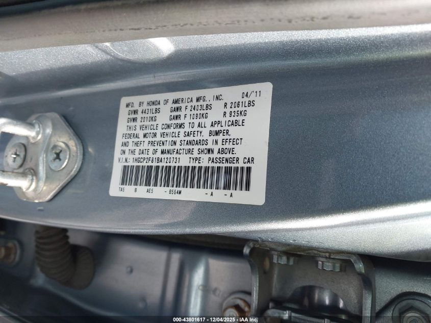 2011 HONDA ACCORD 2011 року Бензин, 2.4, Передний привод, vin - 1HGCP2F81BA120731 из США
