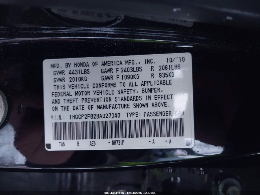 2011 HONDA ACCORD 2011 року Бензин, 2.4, Передний привод, vin - 1HGCP2F82BA027040 из США