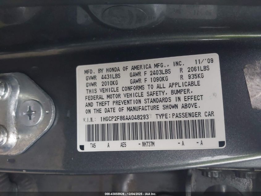 Цвет СерыйЦилиндры 4Привод Передний приводVIN 1HGCP2F86AA048293Состояние СтационарноПовреждения Передняя или задняя AutoRIA