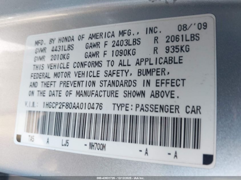 2010 HONDA ACCORD 2010 року Бензин, 2.4, Передний привод, vin - 1HGCP2F80AA010476 из США