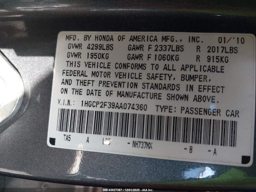 Цвет СерыйЦилиндры 4Привод Передний приводVIN 1HGCP2F39AA074360Состояние СтационарноПовреждения МоторДата аукциона 2025-12-17 AutoRIA