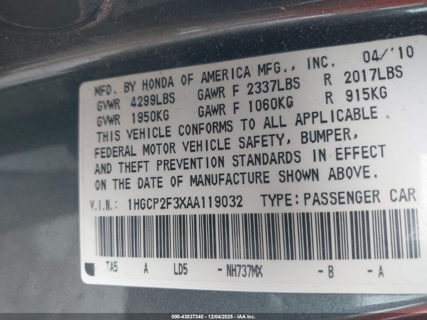 2010 HONDA ACCORD 2010 року Бензин, 2.4, Передний привод, vin - 1HGCP2F3XAA119032 из США
