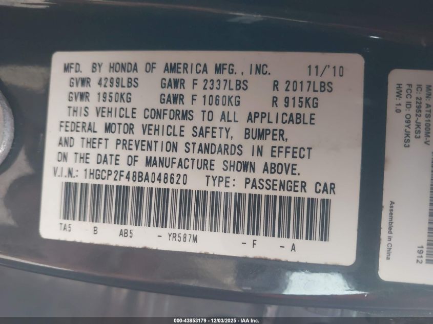 2011 HONDA ACCORD 2011 року Бензин, 2.4, Передний привод, vin - 1HGCP2F48BA048620 из США