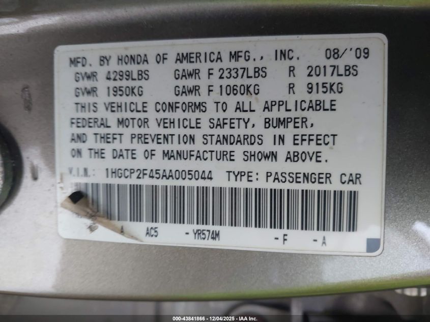 2010 HONDA ACCORD 2010 року Бензин, 2.4, Передний привод, vin - 1HGCP2F45AA005044 из США