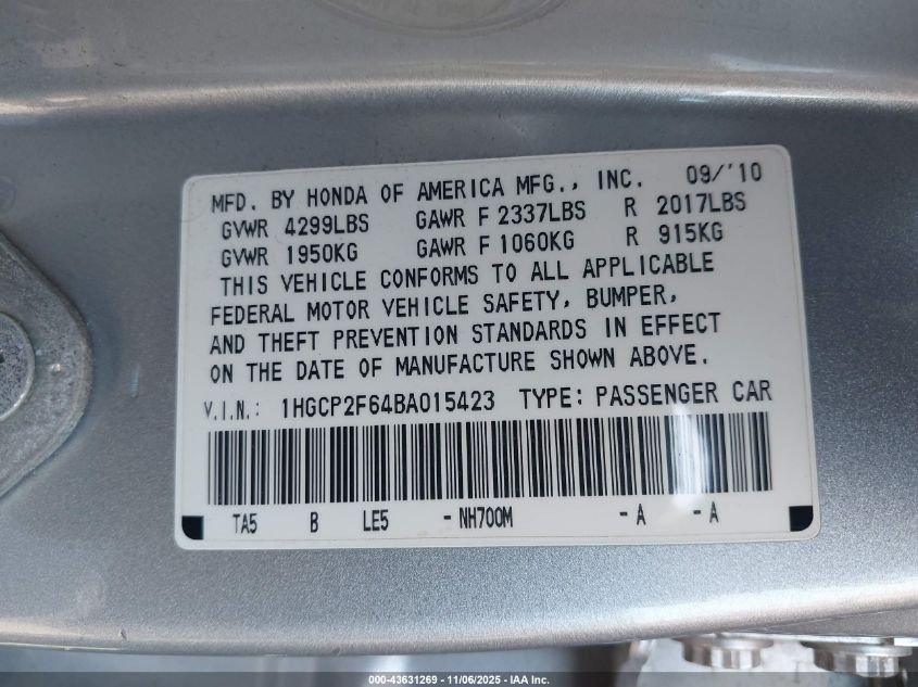 2011 HONDA ACCORD 2011 року Бензин, 2.4, Передний привод, vin - 1HGCP2F64BA015423 из США