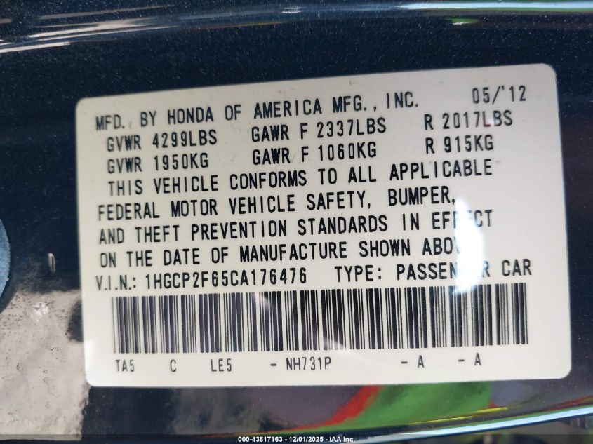 2012 HONDA ACCORD 2012 року Бензин, 2.4, Передний привод, vin - 1HGCP2F65CA176476 из США