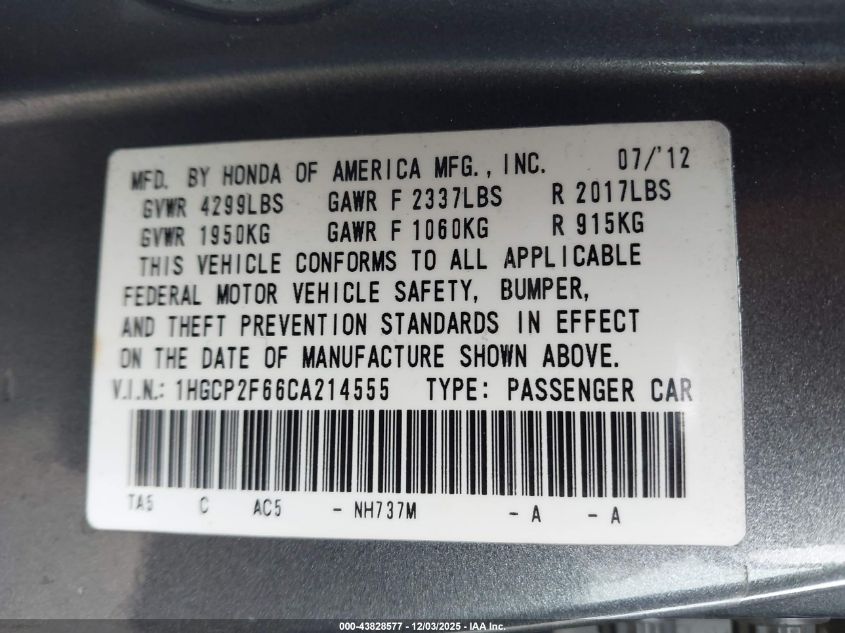 2012 HONDA ACCORD 2012 року Бензин, 2.4, Передний привод, vin - 1HGCP2F66CA214555 из США