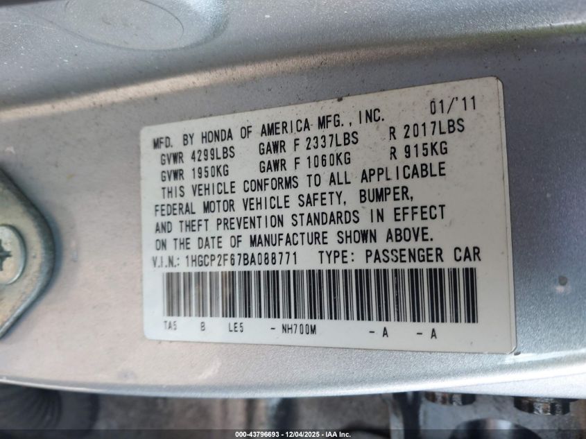 2011 HONDA ACCORD 2011 року Бензин, 2.4, Передний привод, vin - 1HGCP2F67BA088771 из США