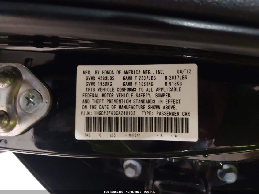 2012 HONDA ACCORD 2012 року Бензин, 2.4, Передний привод, vin - 1HGCP2F60CA240102 из США