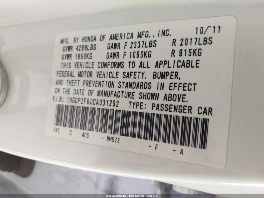 2012 HONDA ACCORD 2012 року Бензин, 2.4, Передний привод, vin - 1HGCP2F60CA031202 из США