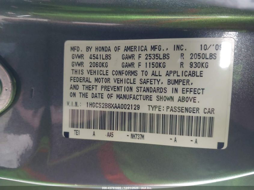 Цвет СерыйЦилиндры 6Привод Передний приводVIN 1HGCS2B8XAA002129Состояние Заводится и едет (проверено)Повреждения Левая сторона AutoRIA