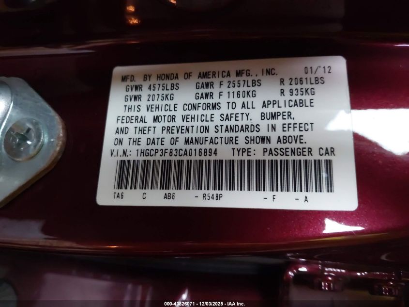 2012 HONDA ACCORD 2012 року Бензин, 3.5, Передний привод, vin - 1HGCP3F83CA016894 из США
