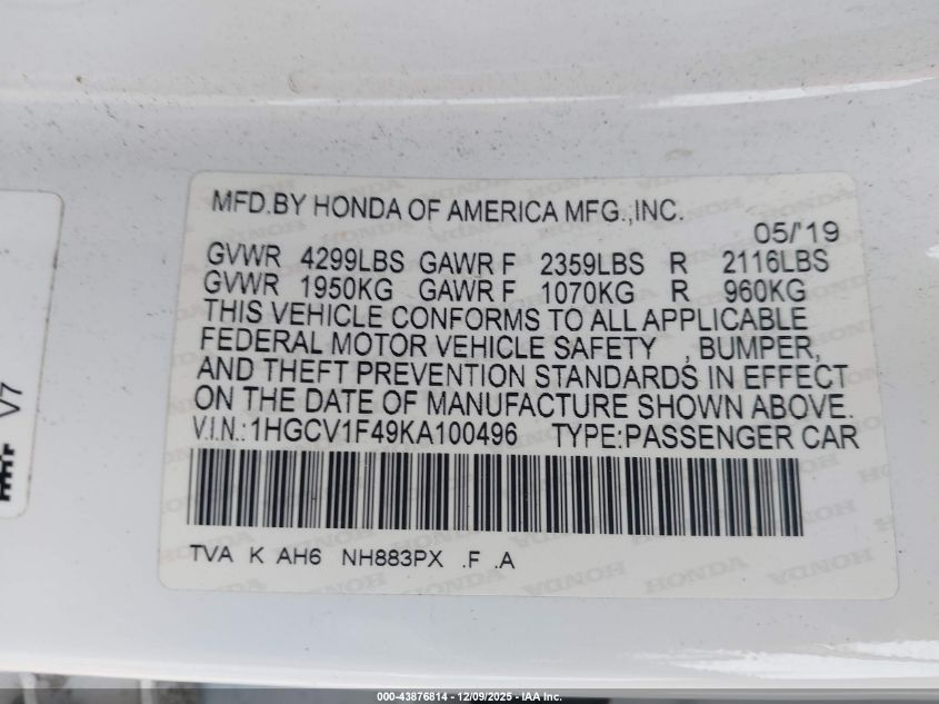 2019 HONDA ACCORD 2019 року Бензин, 1.5, Передний привод, vin - 1HGCV1F49KA100496 из США