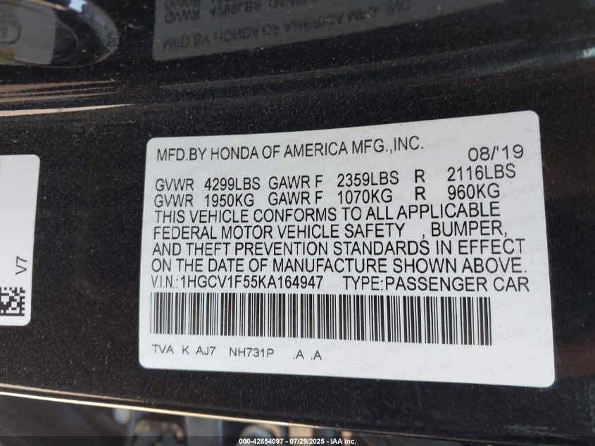2019 HONDA ACCORD 2019 року Бензин, 1.5, Передний привод, vin - 1HGCV1F55KA164947 из США