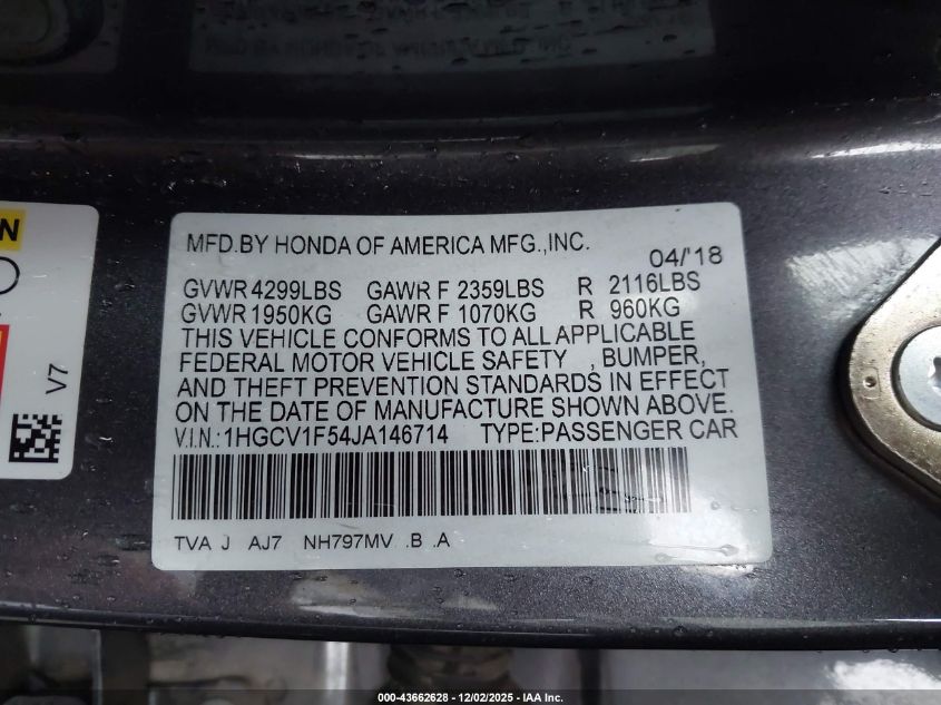 2018 HONDA ACCORD 2018 року Бензин, 1.5, Передний привод, vin - 1HGCV1F54JA146714 из США