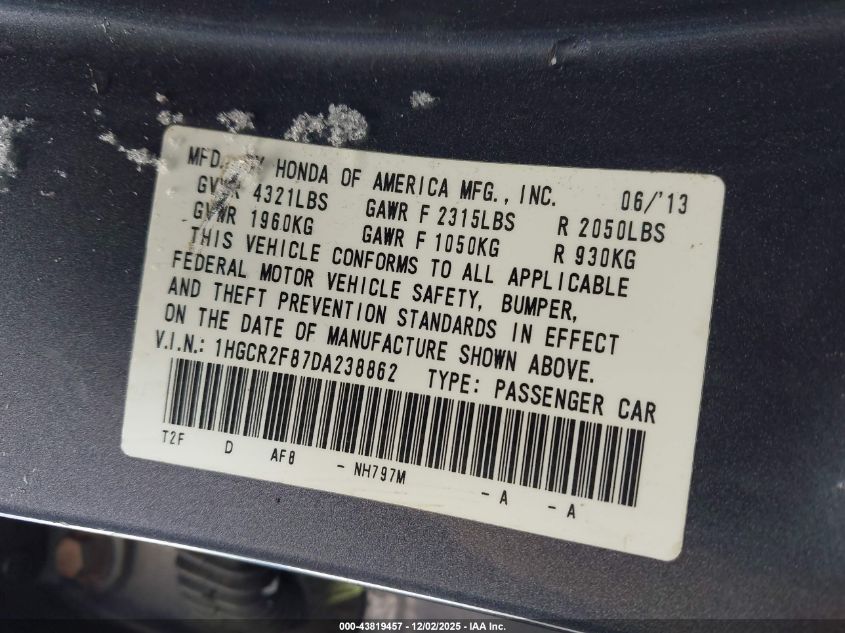 Цвет СерыйЦилиндры 4Привод Передний приводVIN 1HGCR2F87DA238862Состояние Заводится и едет (проверено)Повреждения Передняя или задняя AutoRIA