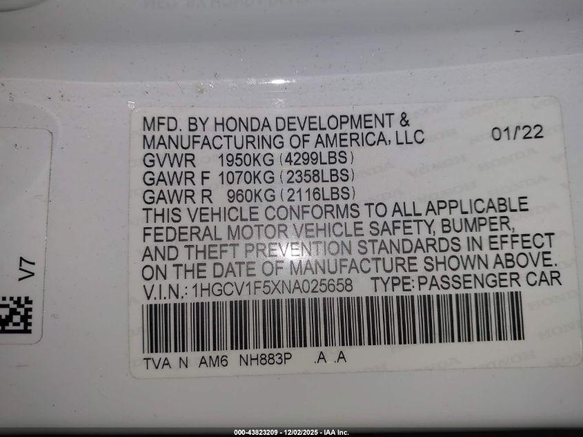 2022 HONDA ACCORD 2022 року Бензин, 1.5, Передний привод, vin - 1HGCV1F5XNA025658 из США