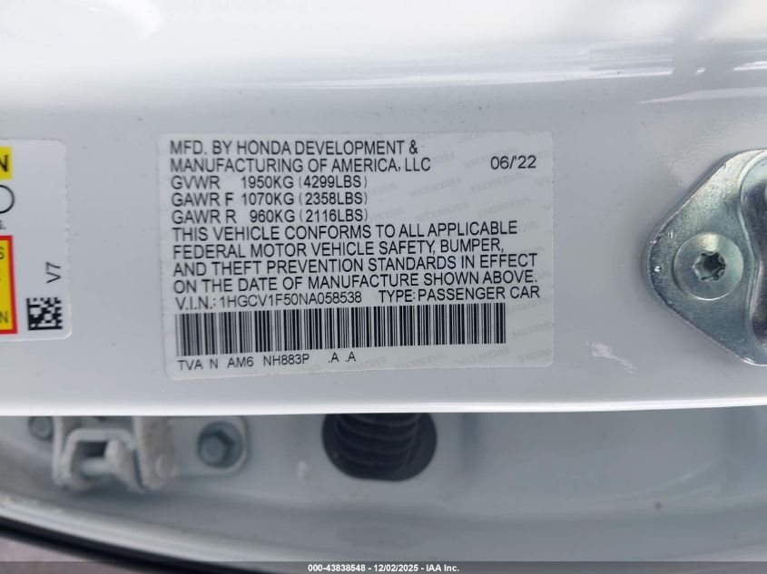 2022 HONDA ACCORD 2022 року Бензин, 1.5, Передний привод, vin - 1HGCV1F50NA058538 из США