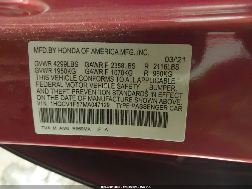 2021 HONDA ACCORD 2021 року Бензин, 1.5, Передний привод, vin - 1HGCV1F57MA047129 из США