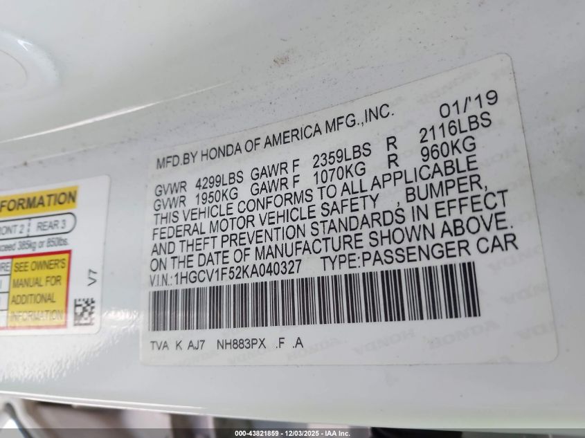 2019 HONDA ACCORD EXL