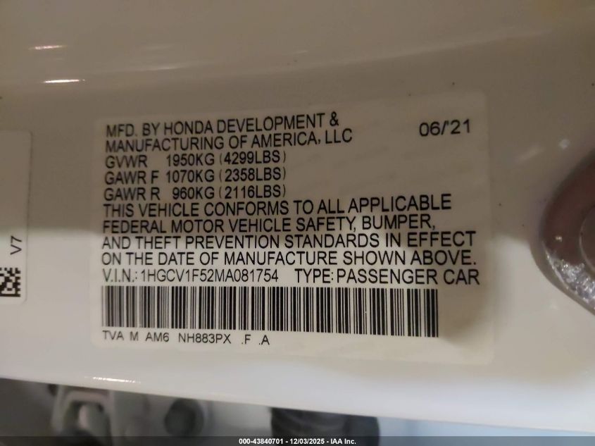 2021 HONDA ACCORD 2021 року Бензин, 1.5, Передний привод, vin - 1HGCV1F52MA081754 из США