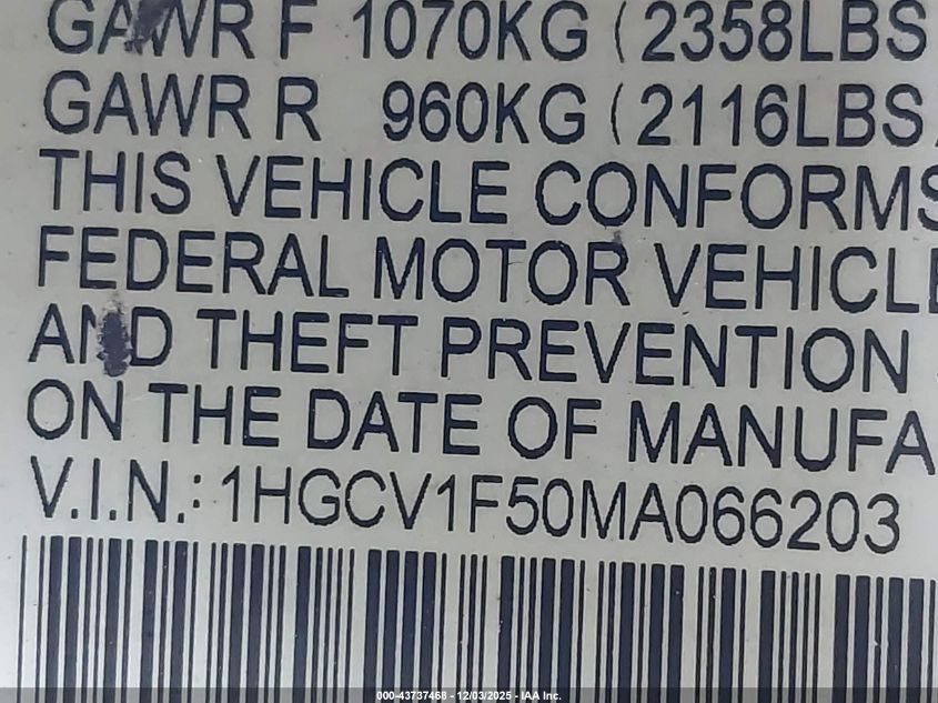 2021 HONDA ACCORD 2021 року Бензин, 1.5, Передний привод, vin - 1HGCV1F50MA066203 из США