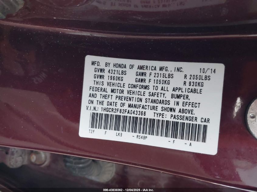 2015 HONDA ACCORD 2015 року Бензин, 2.4, Передний привод, vin - 1HGCR2F82FA043366 из США