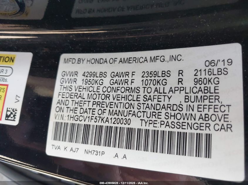 2019 HONDA ACCORD 2019 року Бензин, 1.5, Передний привод, vin - 1HGCV1F57KA120030 из США