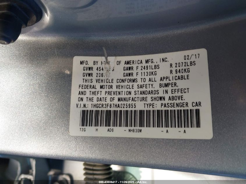 2017 HONDA ACCORD 2017 року Бензин, 3.5, Передний привод, vin - 1HGCR3F87HA025955 из США