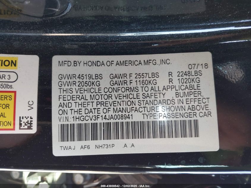 2018 HONDA ACCORD 2018 року Гибрид, 2.0, Передний привод, vin - 1HGCV3F14JA008941 из США