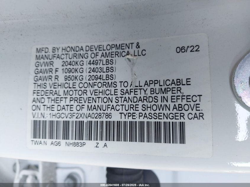2022 HONDA ACCORD 2022 року Гибрид, 2.0, Передний привод, vin - 1HGCV3F2XNA028786 из США