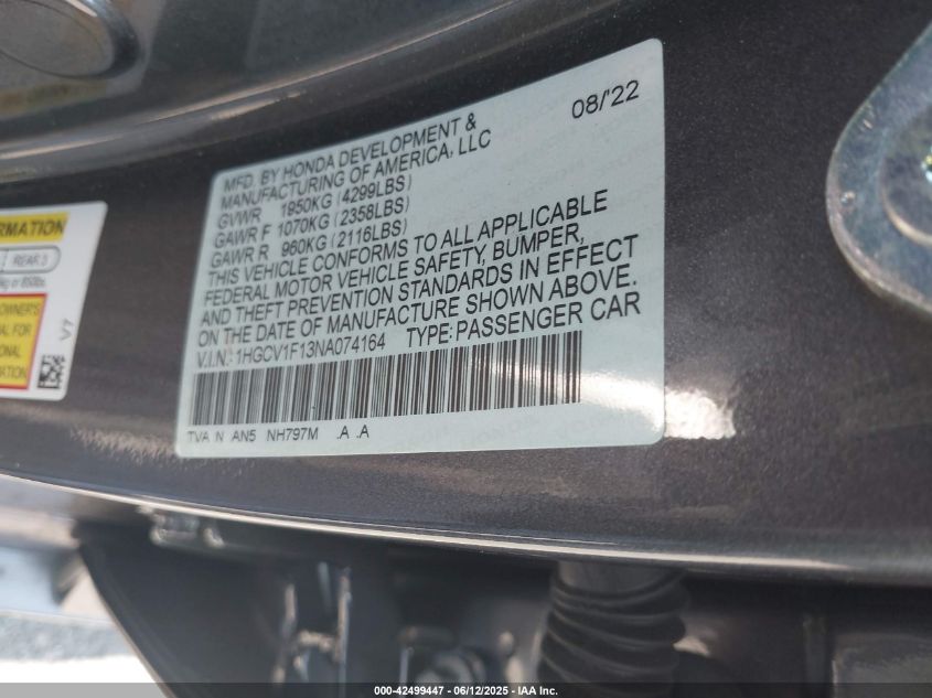 2022 HONDA ACCORD 2022 року Бензин, 1.5, Передний привод, vin - 1HGCV1F13NA074164 из США