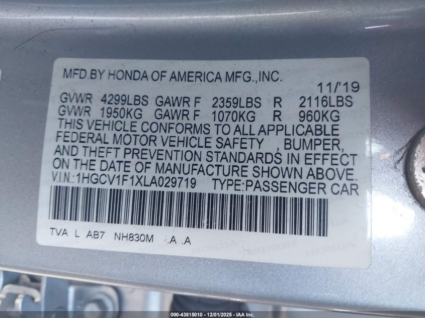 2020 HONDA ACCORD 2020 року Бензин, 1.5, Передний привод, vin - 1HGCV1F1XLA029719 из США