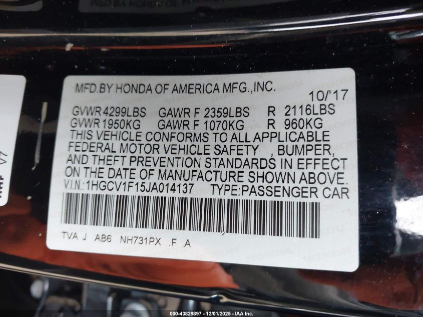 2018 HONDA ACCORD 2018 року Бензин, 1.5, Передний привод, vin - 1HGCV1F15JA014137 из США