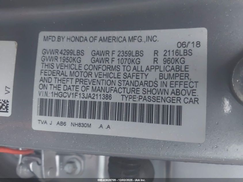 2018 HONDA ACCORD 2018 року Бензин, 1.5, Передний привод, vin - 1HGCV1F13JA211386 из США