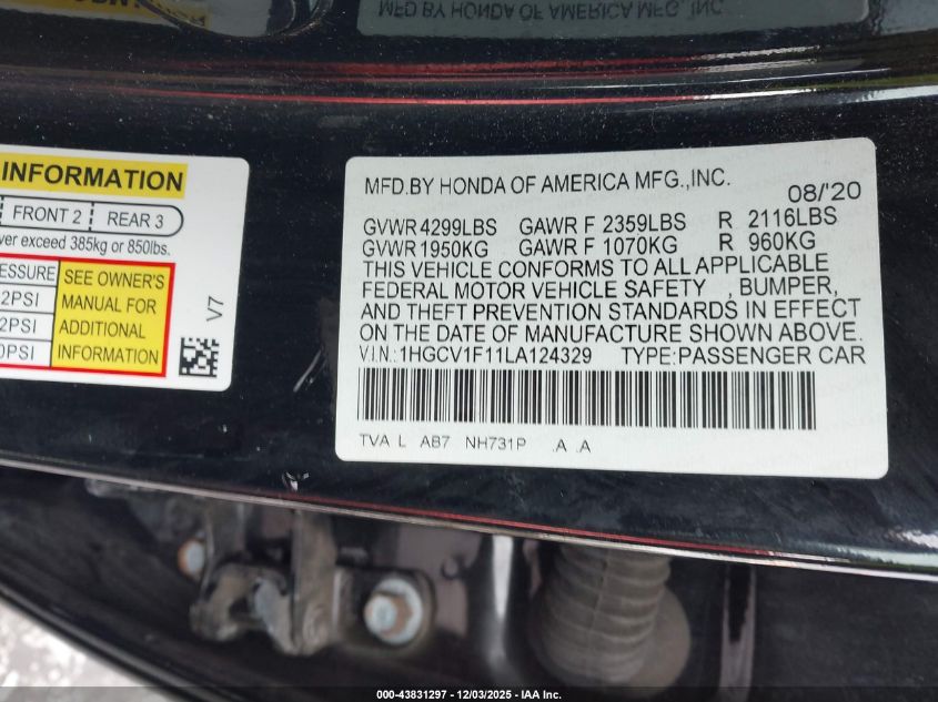 2020 HONDA ACCORD 2020 року Бензин, 1.5, Передний привод, vin - 1HGCV1F11LA124329 из США