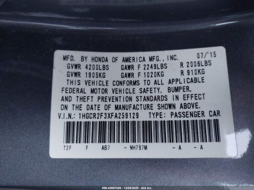 2015 HONDA ACCORD 2015 року Бензин, 2.4, Передний привод, vin - 1HGCR2F3XFA259129 из США