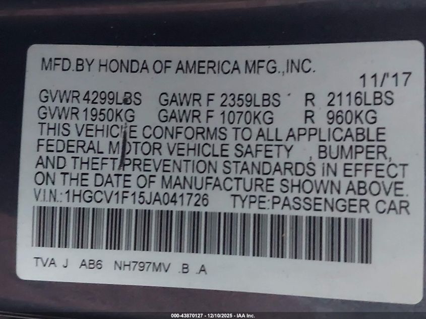 2018 HONDA ACCORD 2018 року Бензин, 1.5, Передний привод, vin - 1HGCV1F15JA041726 из США