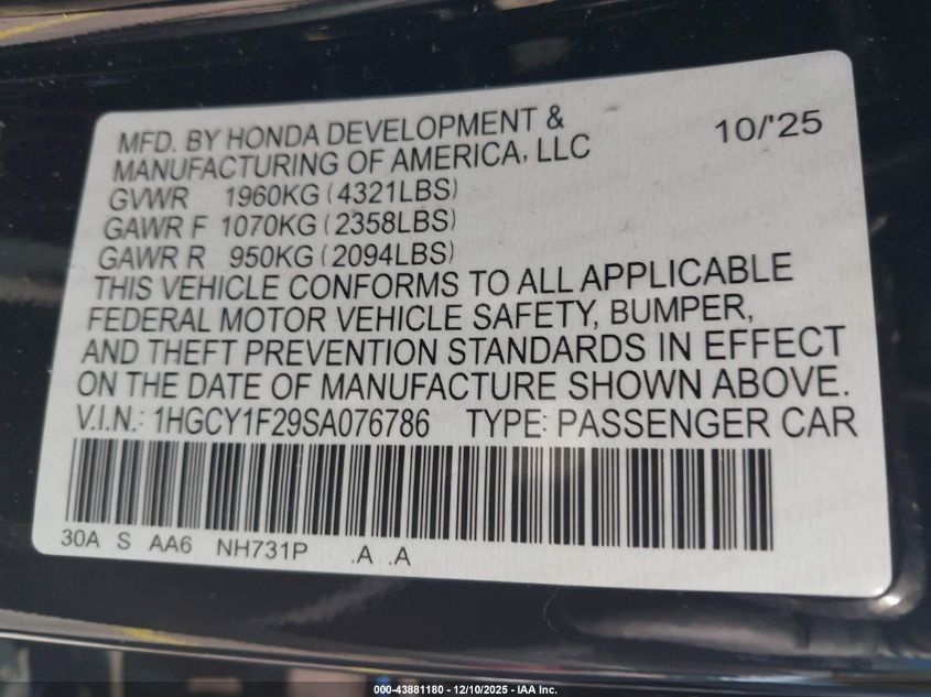 2025 HONDA ACCORD 2025 року Бензин, 1.5, Передний привод, vin - 1HGCY1F29SA076786 из США