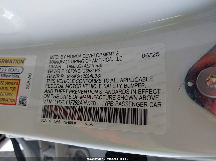 2025 HONDA ACCORD 2025 року Бензин, 1.5, Передний привод, vin - 1HGCY1F25SA047303 из США