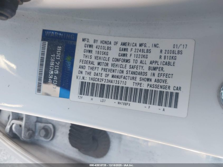 2017 HONDA ACCORD 2017 року Бензин, 2.4, Передний привод, vin - 1HGCR2F33HA135710 из США