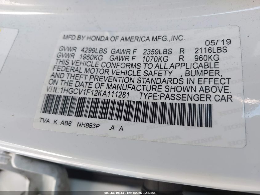 2019 HONDA ACCORD 2019 року Бензин, 1.5, Передний привод, vin - 1HGCV1F12KA111281 из США