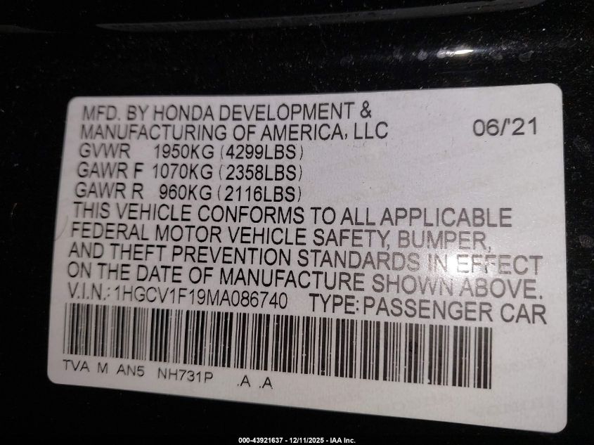 2021 HONDA ACCORD 2021 року Бензин, 1.5, Передний привод, vin - 1HGCV1F19MA086740 из США