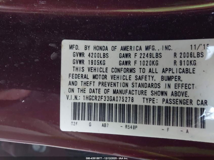 Цвет БургундияЦилиндры 4Привод Передний приводVIN 1HGCR2F33GA075278Состояние Заводится и едет (проверено)Повреждения Левая сторона AutoRIA