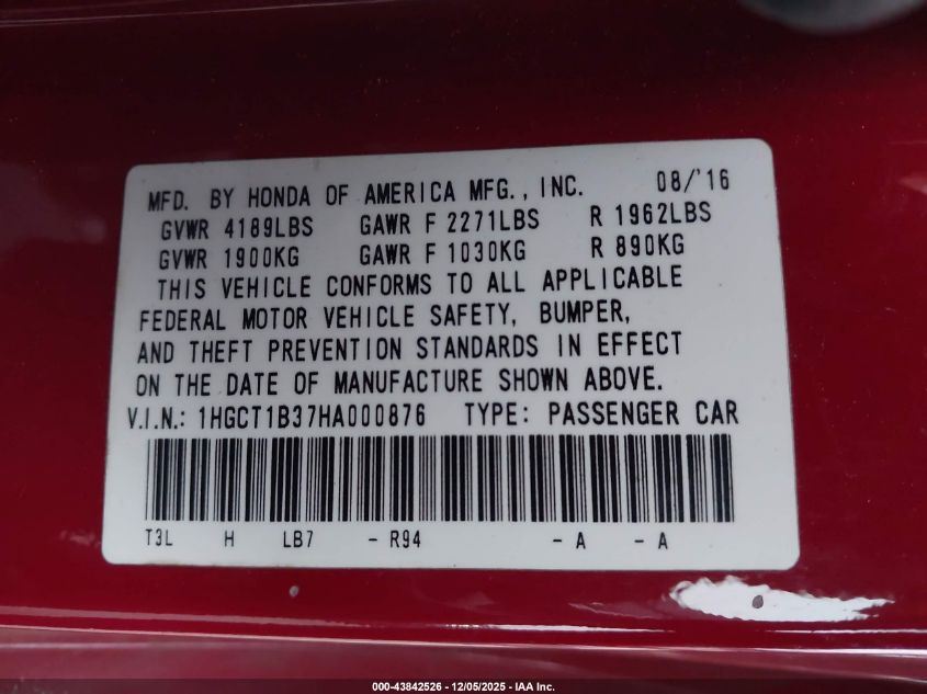 2017 HONDA ACCORD 2017 року Бензин, 2.4, Передний привод, vin - 1HGCT1B37HA000876 из США