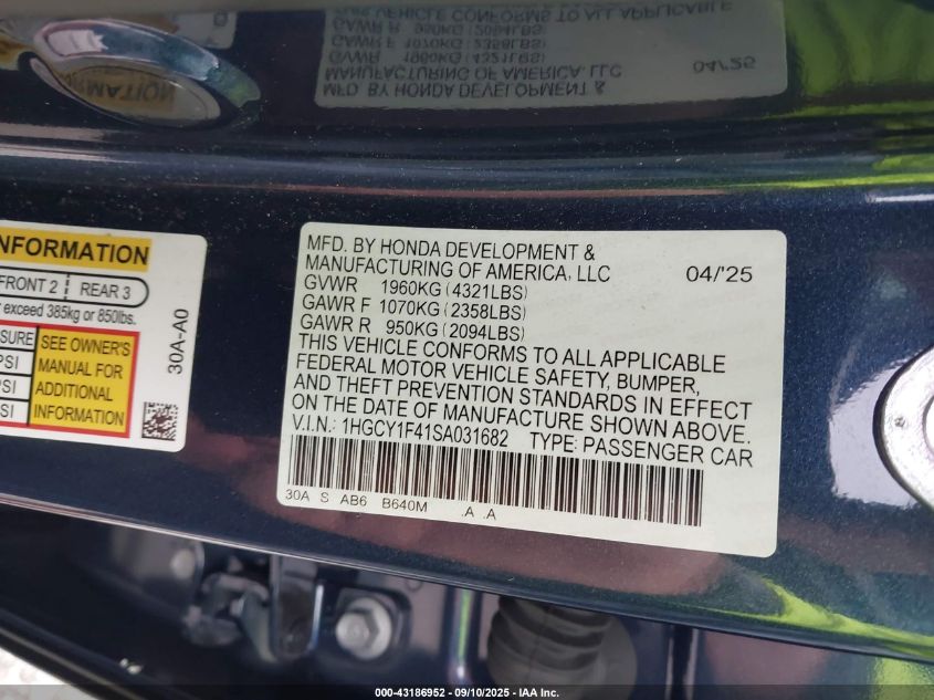 Цвет СинийЦилиндры 4Привод Передний приводVIN 1HGCY1F41SA031682Состояние СтационарноПовреждения Передняя или задняя AutoRIA