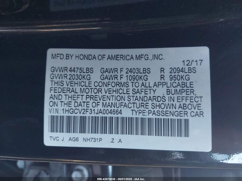 2018 HONDA ACCORD 2018 року Бензин, 2.0, Передний привод, vin - 1HGCV2F31JA004664 из США
