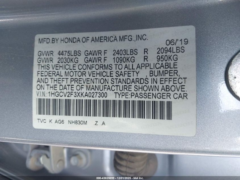 2019 HONDA ACCORD 2019 року Бензин, 2.0, Передний привод, vin - 1HGCV2F3XKA027300 из США